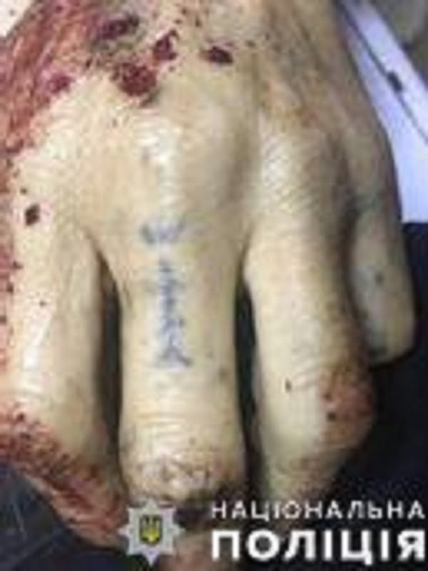 У мужчины имеется татуировка на левой руке в виде двух точек на мизинце и православного креста на среднем пальце.