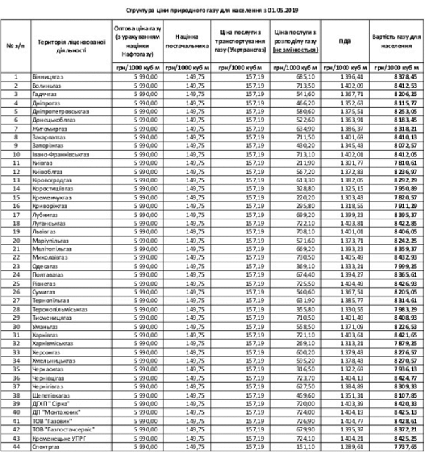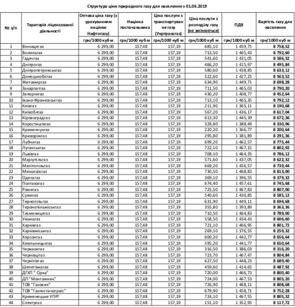 Кроме того, дополнительные соглашения «Нафтогаза» также урегулируют вопрос оптовой цены для нужд бытовых потребителей на июнь 2019 года, которая составит 6 299,00 грн. за 1 тыс. куб. м., а, следовательно, конечная цена газа должна составлять 8 627,01 грн. за 1 000 куб. м. Однако цены будут разными в каждой области.