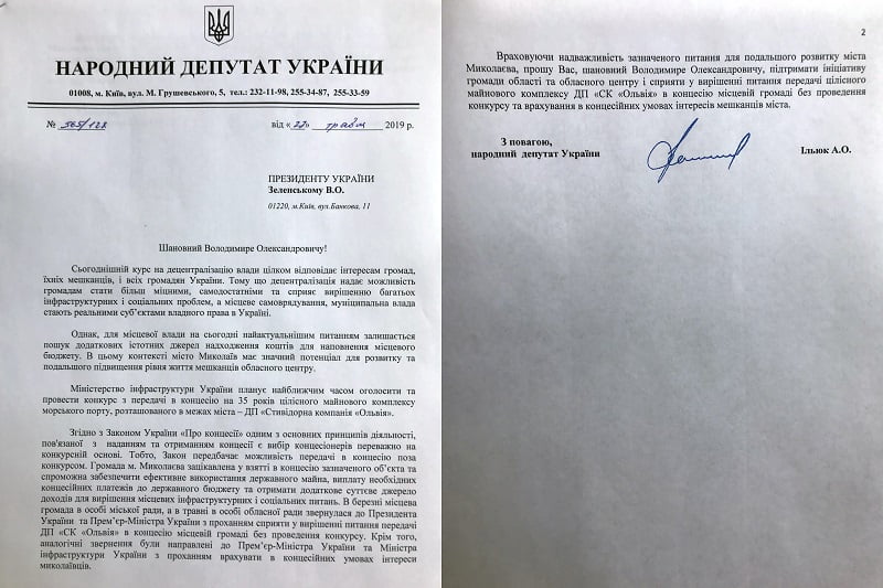 В своем обращении нардеп Ильюк предложил Президенту Зеленскому поспособствовать передачи порта «Ольвия» городской общине Николаева без конкурса – это позволяет закон.