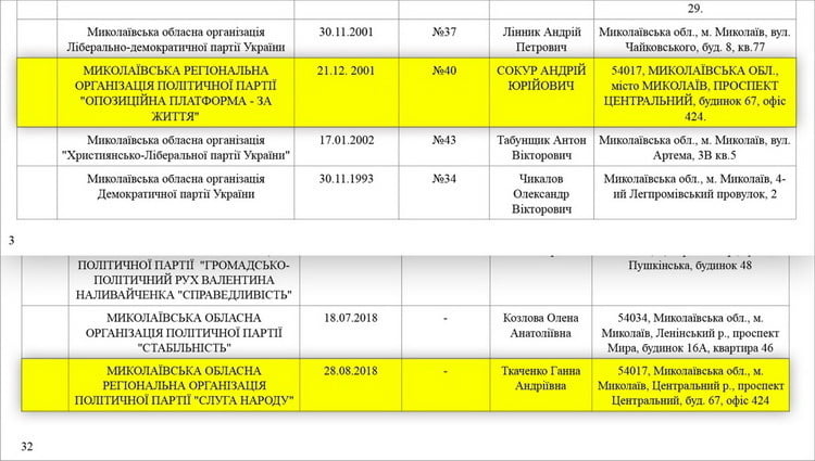 Партии «Слуга народа» и «Оппозиционная платформа «За життя» зарегистрировали свои областные организации в Николаевской области по одинаковому адресу — офис №424 по проспекту Центральному, 67.