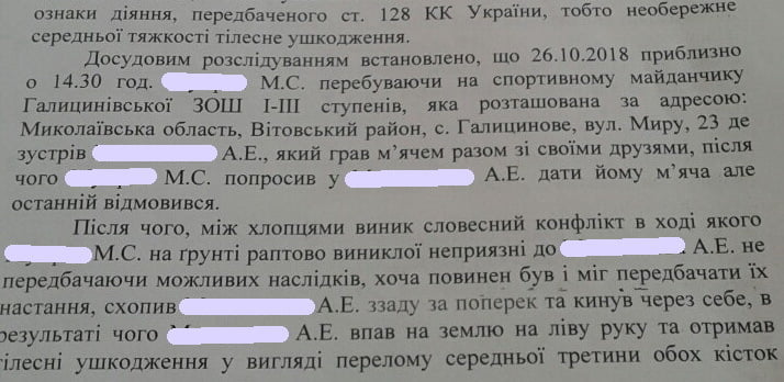 «Это крик души о несправедливости. Начну с самого начала: 26 октября 2018 года на территории Галициновской школы во время учебного процесса, перед уроком физкультуры 8″А» класса, мой сын Антон и его одноклассники Анна, Никита, Данил перед уроком вышли на улицу (на школьное игровое поле) попасовать футбольний мяч. К ним начал приставать ученик 9 класса Максим, чтобы они ему отдали мяч, ребята ему ответили, что у них сейчас будет урок физкультуры и чтобы он шел и им не мешал. Ребята начали между собой пасовать мяч, Максиму не понравился их отказ, пошла перепалка словесная, и в итоге Максим выхватил мяч, Антон сказал: «Отдай», но в ответ ему Максим заявил: «Я тебя сейчас кину через прогиб, малявка» и подошел с угрозой к сыну. Антон его попросил этого не делать, но он его не услышал и, ухватив сына сзади и подняв, перекинул через себя (чтоб Вам было понятно, подросток М. в два раза выше моего сына и, естественно, больше телосложением, ему не доставило неудобств поднять восьмиклассника и перекинуть через себя).