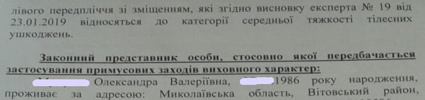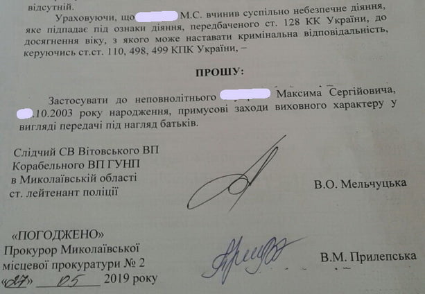В конце мая 2019 года в Жовтневый районный суд для рассмотрения по сути было передано ходатайство прокурора о применении принудительных методов воспитательного характера к несовершеннолетнему М., подозреваемому в совершении общественно опасного действия, имеющего признаки криминального правонарушения, предусмотренного статьей 128 («Неосторожное тяжкое или средней тяжести телесное повреждение», что наказывается общественными работами на срок от 150 до 240 часов или исправительными работами на срок до 2 лет, или ограничением свободы на срок до 2 лет) УК Украины.