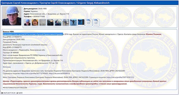 Стоит отметить, что на сайте «Миротворец» есть профиль Сергея Григорьева, где указано, что он в 2014 году участвовал в боях против ВСУ в составе «Русской Православной Армии». После он сбежал на территорию Российской Федерации. Также на сайте размещены его фото, где он позирует с оружием, и документы, подтверждающие его причастность к боевикам. Среди прочего, есть два документа от руководителя «Союза добровольцев Донбасса» Андрея Пинчука на имя вр.и.о. начальника управления по вопросам миграции ГУ МВД по г. Москве Дмитрию Сергиенко, в которых последнего просят предоставить Сергею Григорьеву статус беженца и не экстрадировать его в Украину.