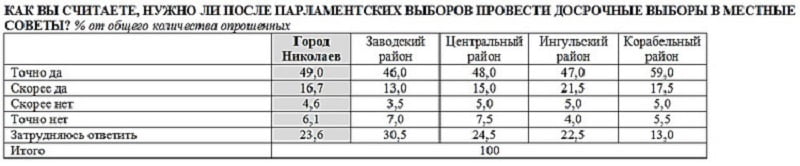 Так, 76,5% жителей района (59% + 17,5%) — за необходимость проведения досрочных выборов в местные советы, что превышает средние показатели по городу. Так, на вопрос: «Как вы считаете, нужно ли после парламентских выборов провести досрочные выборы в местные советы?» ответили «Точно, да» 59% респондентов в Корабельном районе (в среднем по городу – 49,0%), а «Скорее, да» – еще 17,5% (по городу – 16,7%).