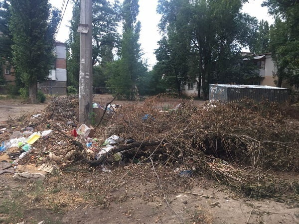 Если плохо видно, поясняю - эта мусорка на 10 домов!!! Основной мусор в ней - ветки, срезанные ещё осенью, когда тополя пилили и акации. И почему я, оплачивая своевременный вывоз мусора, должна нюхать его целую неделю???? Если бы баки были не переполнены, никто бы рядом не складировал!!!