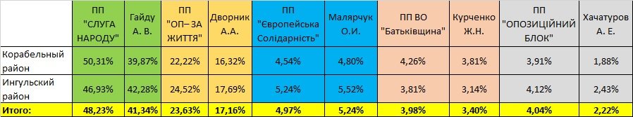 Так, например, жители Корабельного района г. Николаева на прошедших 21 июля выборах активно поддержали партию «Слуга народа» (более половины проголосовавших выбрали ее в общем списке), однако у кандидата-мажоритарщика от этой же партии (Александра Гайду) рейтинг значительно отличается — за него проголосовали менее сорока процентов от общей явки. Его «антирейтинг» на избирательных участках, расположенных в Корабельном районе, — самый высокий: он составляет 10,44% (в Ингульском районе — 4,65%).
