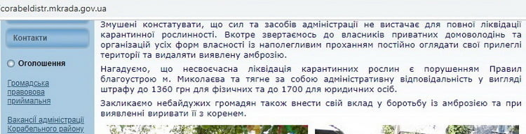 Напоминаем, что несвоевременная ликвидация карантинных растений является нарушением Правил благоустройства г. Николаева и влечет за собой административную ответственность в виде штрафа до 1360 грн для физических и до 1700 грн для юридических лиц.