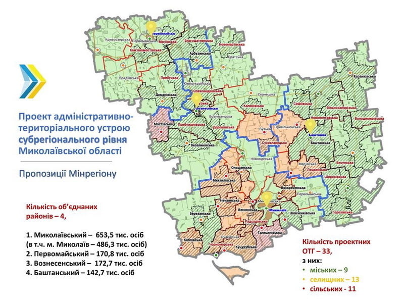 Николаевская область в случае одобрения будет иметь четыре района: Николаевский, Первомайский, Вознесенский и Баштанский. Регион разобьют на 33 ОТГ: 9 — городских, 13 — поселковых, 11 — сельских.