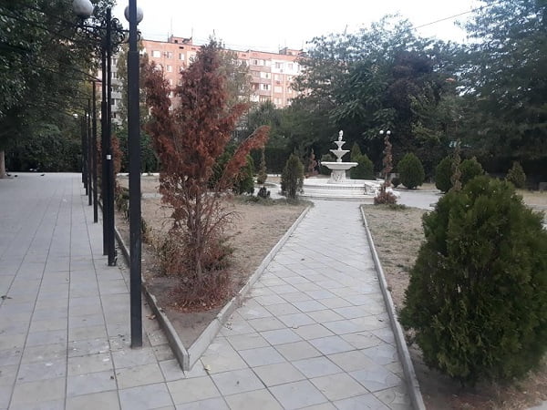 «Парк между гостиницей «Металлург» и «Фуршетом» в Октябрьском. Не поливается никогда, ёлки постоянно новые садят. Я представляю, сколько они стоят, особенно «спираль».