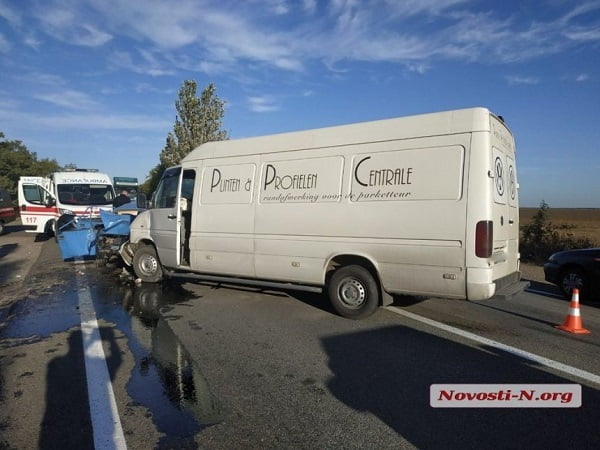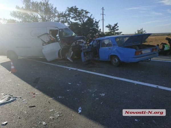 Как сообщают «Новости-N», Микроавтобус «Фольксваген» ехал со стороны Одессы, в направлении Николаева. В районе поворота на село Красноармейское, перед микроавтобусом резко затормозил седельный тягач «ДАФ» с полуприцепом. Водитель «Фольксвагена» затормозить явно не успевал, поэтому резко вывернул руль влево, ударил полуприцеп седельного тягача и выехал на встречную полосу, где лоб в лоб столкнулся с ехавшими во встречном направлении «Жигулями».