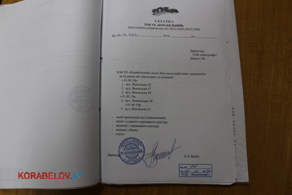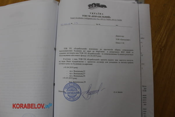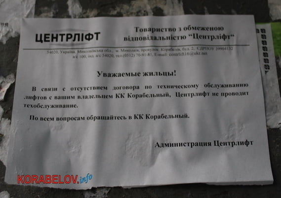 «В начале конфликта «Центрлифт» принял сторону УК «Місто для людей Миколаїв», долгое время отказываясь признавать право УК «Корабельный» на обслуживание домов в Кульбакино, игнорировал все запросы «Корабельный» на предоставление договора и цен на обслуживание, — говорит Н. В. Войтасик, в доказательство своих слов предоставив исходящие письма для «Центрлифта» еще за май и июнь.