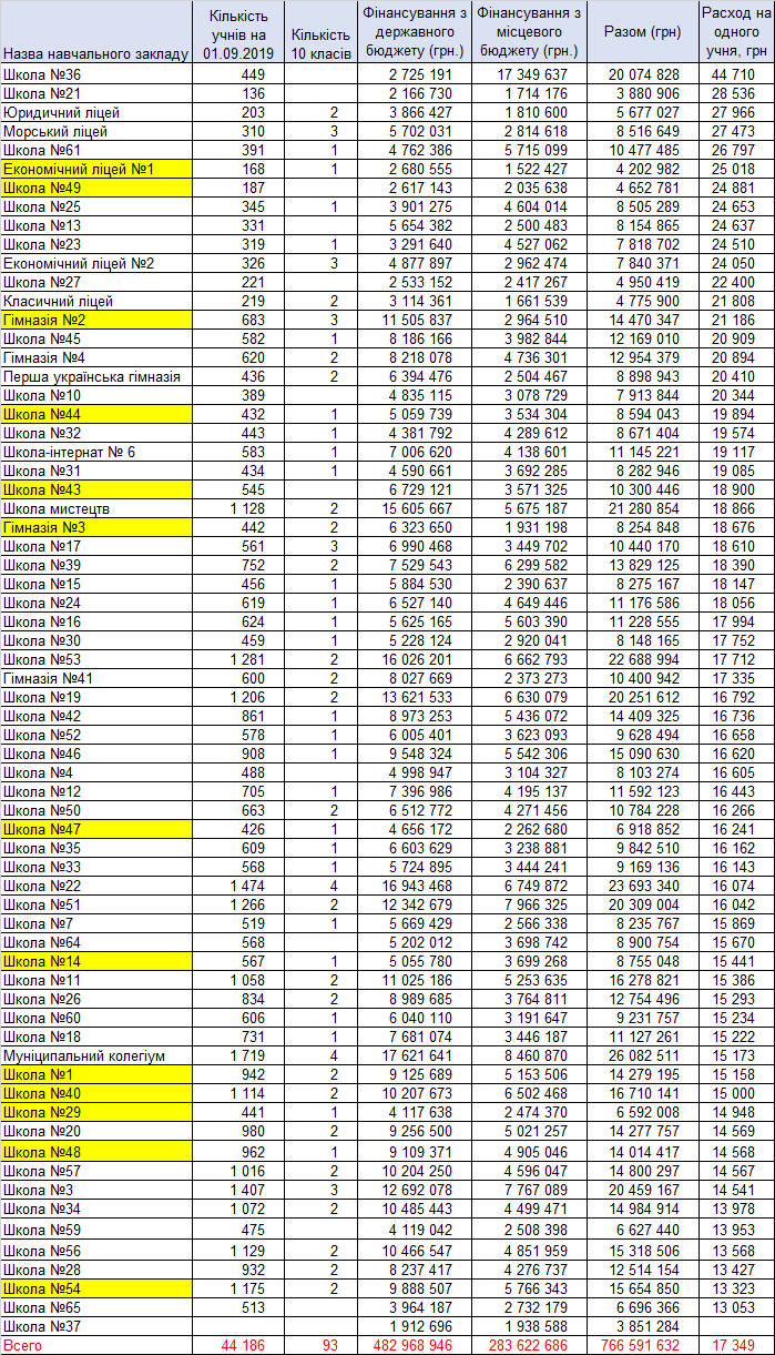 Если разделить количество выделенных на школу средств на количество ее учащихся, получим упрощенную сумму, во сколько обходится (не считая денег, сданных на местах в фонды школы/класса родителями) обучение одного школьника. В Николаевском управлении образования считают некорректными такие расчеты, поскольку, мол, на количество выделяемых на школу денег влияет не только число учеников, а и площади здания и территории, численность педагогического и технического персонала, наличие/отсутствие подвоза учеников и т.д. По нашему же мнению, проведенные нами расчеты всё же дают общее представление, какие школы «влетают в копеечку», а на ком экономят, и всегда ли это оправдано, глядя на конечный результат обучения.