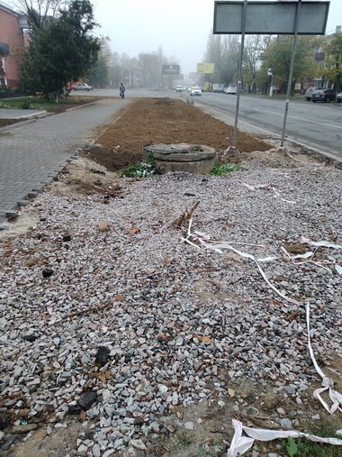 «Ремонт по миколаївські… Корабельний р-н. Старий ДК. Ще не завершили роботу, а плитка вже пішла вниз. Газони замість чорнозему, засипають звичайною глиною… Найприкольніше, розсипаний гравій на майбутніх газонах не прибрали, просто засипають глиною. Цікаво, там щось буде рости?????»