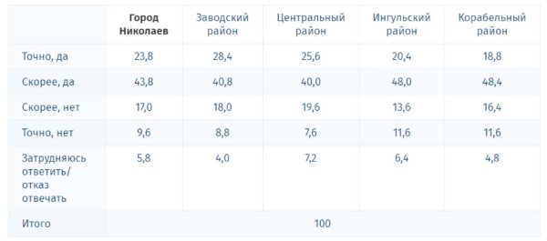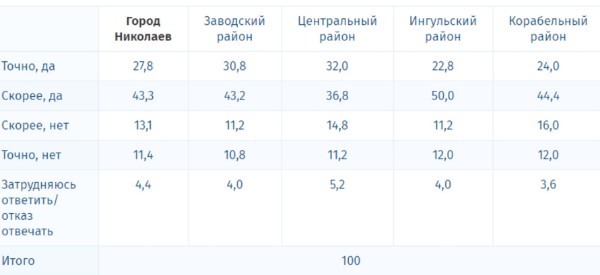 Большинство жителей Корабельного района города Николаева доверяют Президенту Украины Владимиру Зеленскому и довольны результатами его работы. Однако среди николаевцев самый большой процент тех, кто НЕ доверяет действующему Президенту, зафиксирован именно среди жителей Корабельного района — 28% (12% точно не доверяют + 16% скорее нет). Еще 3,6% «корабельщиков» затруднились ответить на этот вопрос.