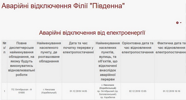 На сайте «Николаевоблэнерго» подтверждается, что аварийное отключение света возникло из-за повреждения кабельной линии. Возобновить электричество в зданиях по пр. Богоявленскому и пр. Корабелов планируют то ли сегодня, то ли завтра — в колонке с названием «Ориентировочная дата и время восстановления электроснабжения» значится 02.12.2019 13:05, а в колонке «Фактическая дата и время восстановления электроснабжения» — 01.12.2019 16:16, хотя фактически это время еще не наступило…