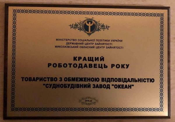 Товариство з обмеженою відповідальністю «СУДНОБУДІВНИЙ ЗАВОД «ОКЕАН» отримав нагороду «Кращий роботодавець року» — підприємство відзначили на Форумі кращих роботодавців Миколаївщини «Грані співпраці в контексті новітніх змін», що проходив 16 грудня.