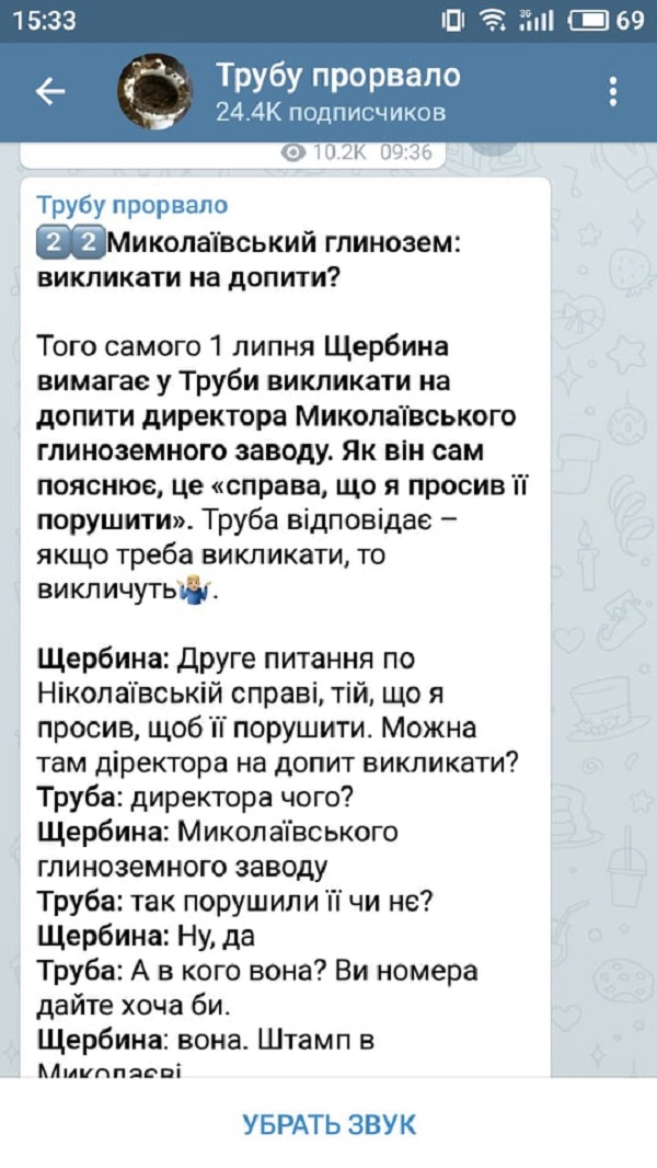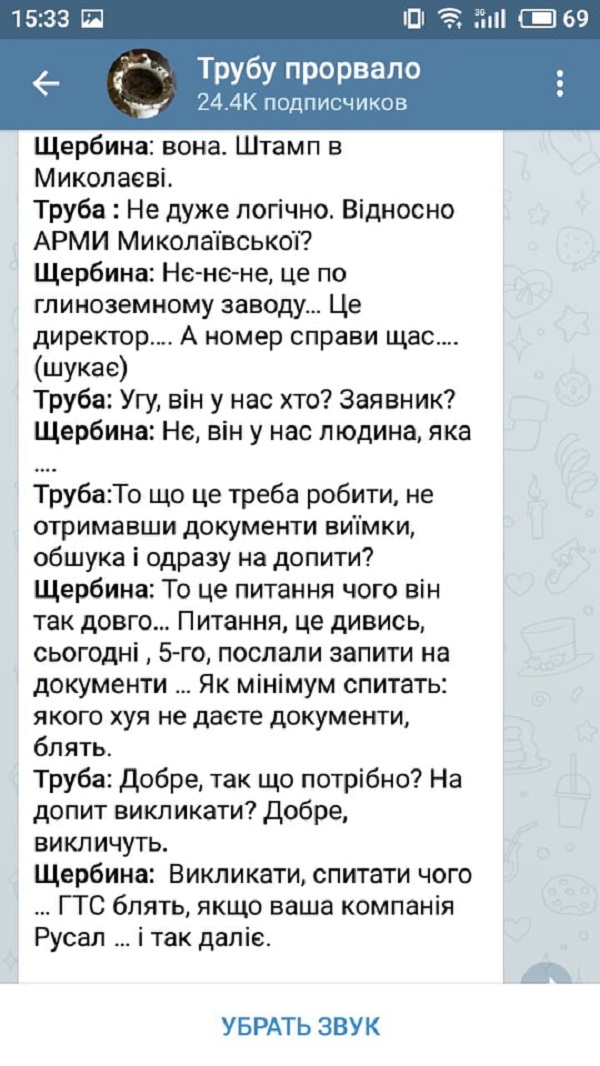 Telegram-канал «Трубу прорвало» вновь опубликовал записи разговоров из кабинета бывшего директора Государственного бюро расследований Романа Трубы, один из которых касался «Николаевского глиноземного завода» как раз накануне обысков на предприятии.