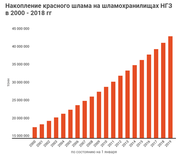 По состоянию на 1 января 2019 года на шламохранилищах было накоплено 43,5 миллиона тонн красного шлама. Это 82,2% от всех накопленных отходов IV класса в Николаевской области.