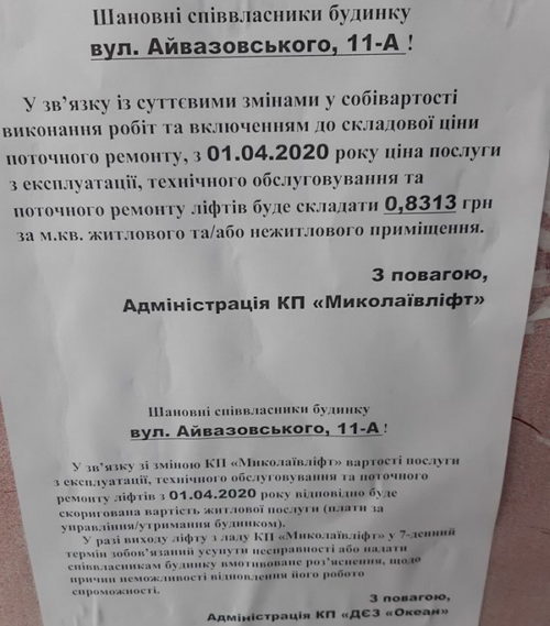 Жительница Корабельного района г. Николаева Ирина С. опубликовала в Фейсбук-группе «Новости «Корабелов.Инфо» фото объявления о повышении цен на обслуживание лифтов, размещенного на подъезде дома по ул. Айвазовского, 11.