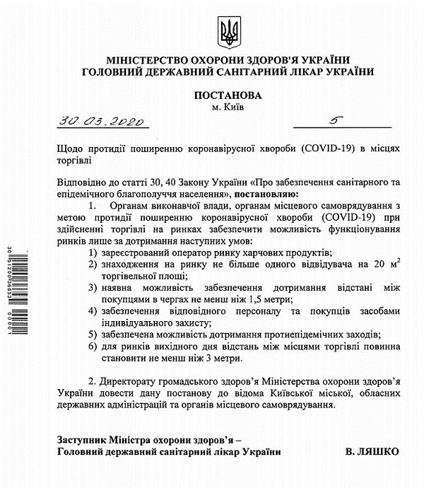 Министерство охраны здоровья Украины опубликовало условия, на которых могут функционировать рынки в условиях карантина. Об этом говорится в постановлении главного санврача Украины Виктора Ляшко от 30 марта 2020 года.