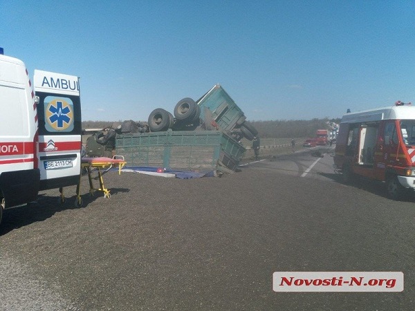 Как сообщают «Новости-N», «КамАЗ» ехал по трассе со стороны Одессы в направлении Николаева. На мосту перед селом Красное грузовик столкнулся с Fiat Doblo, двигавшийся во встречном направлении. После столкновения «КамАЗ» съехал в кювет и перевернулся.