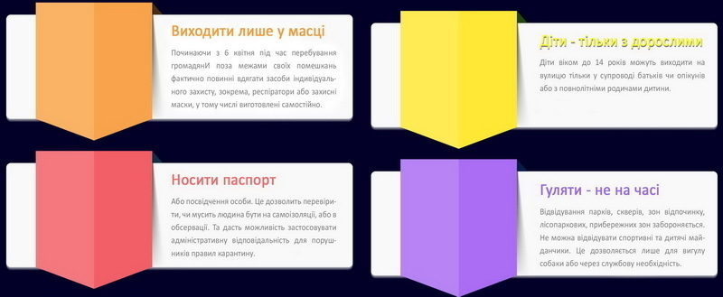 Посилення карантинних заходів, зокрема, забороняє: вихід на вулицю людей старше 60 років (далі читайте про виключення), перебування в громадських місцях без маски чи респіратора; переміщення групою з більш ніж двох осіб, крім випадків службової необхідності та супроводу дітей; перебування в громадських місцях осіб, які не досягли 14 років, без супроводу повнолітніх; відвідування парків, скверів, зон відпочинку, лісопаркових та прибережних зон, крім вигулу домашніх тварин однією особою та у випадку службової необхідності; відвідування дитячих та спортмайданчиків тощо.