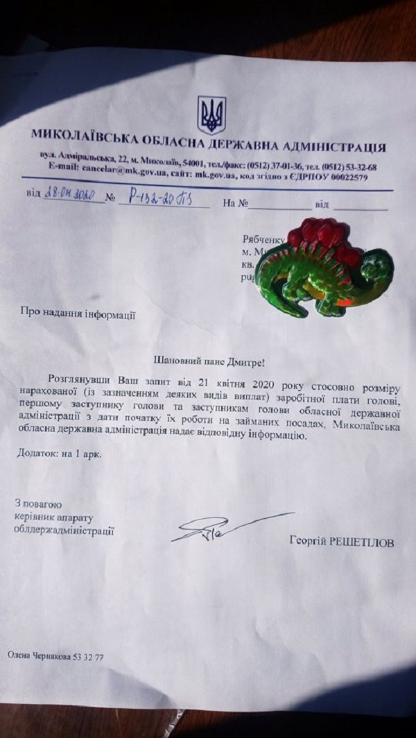 Николаевский активист Дмитрий Рябченко опубликовал ответ на свой запрос относительно зарплат главы облгосадминистрации Александра Стадника и его заместителей.
