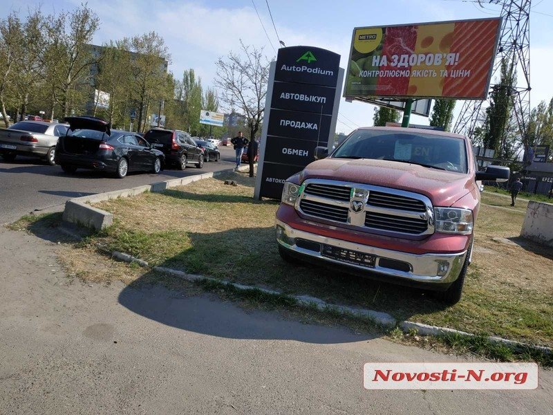 Водитель «Форда» после аварии сообщил, что не успел затормозить, так как засмотрелся на внедорожник Dodge RAM, припаркованный возле салона «Автоподиум» в рекламных целях.
