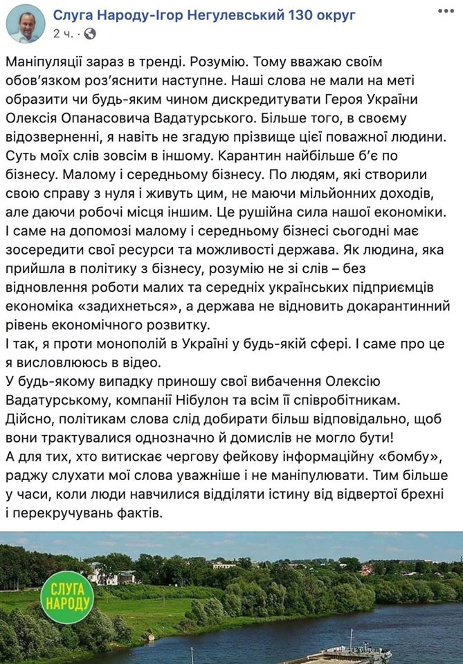 «Наши слова не имели целью оскорбить или каким-либо образом дискредитировать Героя Украины Алексея Афанасьевича Вадатурского. Более того, в своем видеообращении, я даже не вспоминаю фамилию этого уважаемого человека», – пишет Негулевский.