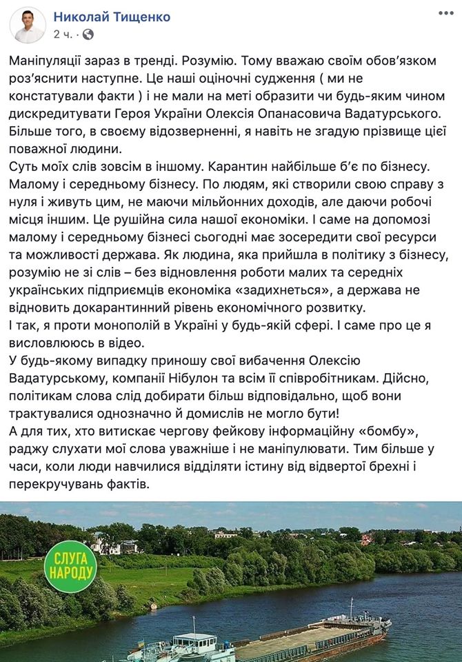 Как известно, нардепы Тищенко и Негулевский на видео назвали «Нибулон» монополистом и высказали в его адрес обвинения: «занес кругом денег во все международные ассоциации, во все фракции и сейчас пытается сбить наш прекраснейший законопроект». В ответ Алексей Вадатурский заявил, что готовит иск против нардепов от «Слуги народа» Игоря Негулевского и Николая Тищенко, которые обвинили его в якобы попытке подкупа депутатов.