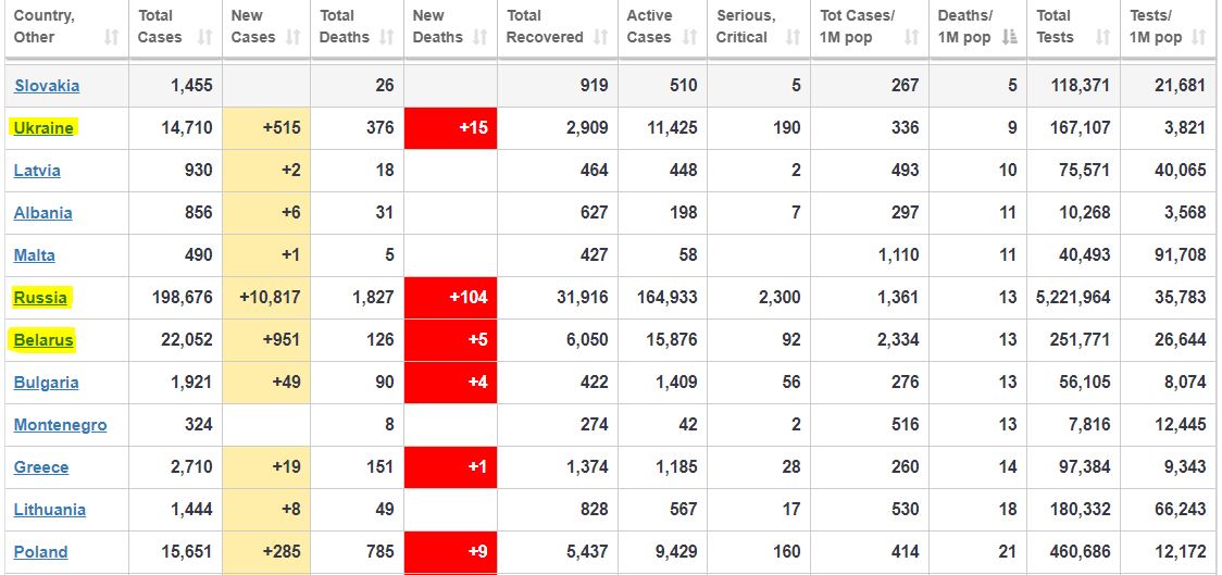 Примечательно, что в Украине все также делается очень мало тестов — сделано всего 167 тысяч (3,8 тыс. на 1 млн жителей). При этом, к примеру, в Беларуси, чья территория намного меньше Украины, сделано уже 251,7 тысяч тестов (26,6 тыс. на 1 млн жителей)