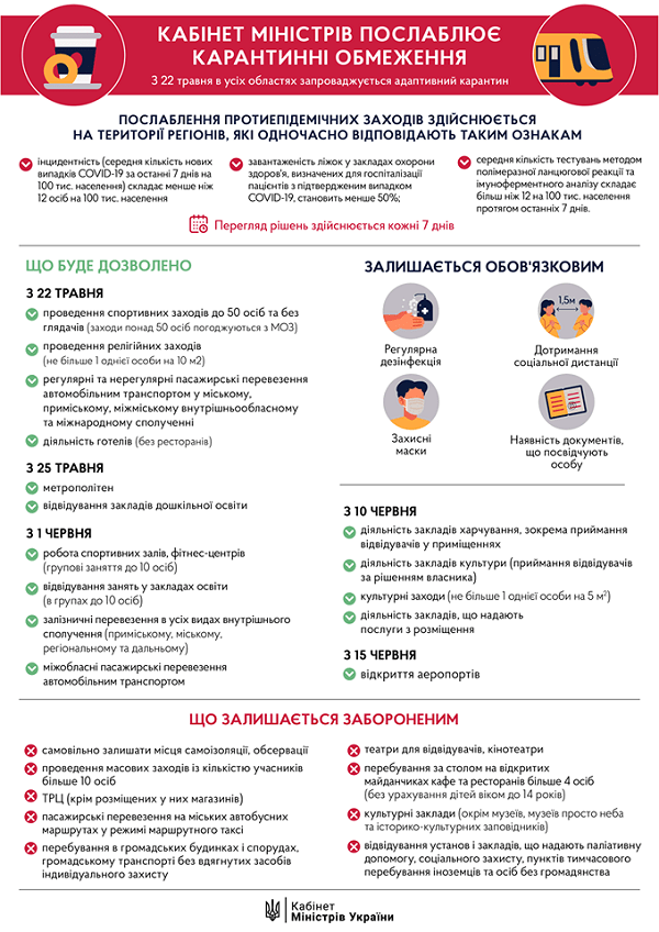 «С сегодняшнего дня Украина переходит к адаптивной модели карантина. В то же время правительство ослабляет общенациональные ограничительные меры, но они будут действовать только в тех регионах, где позволяет эпидемическая ситуация», — написал он.