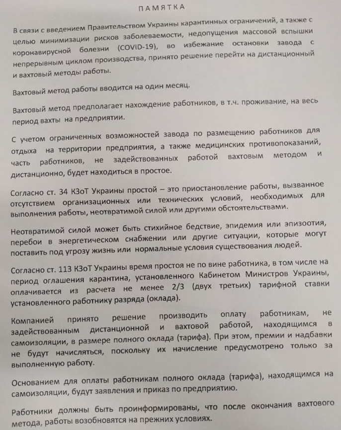 — Люди на заводе поделились на 3 группы: одни захотели остаться на вахту, другие не захотели (силой туда никого не загоняли), и были такие, которые хотели остаться на вахту, но их не взяли, т.к. уже было набрано нужное число людей. Хотя на некоторых участках на какое-то время даже возник недобор, когда узнали, что 100% ставки оплатят за простой.