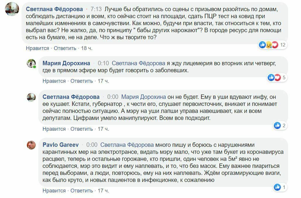 — Лучше бы обратились со сцены с призывом разойтись по домам, соблюдать дистанцию и всем, кто сейчас стоит на площади, сдать ПЦР-тест на COVID-19 при малейших изменениях в самочувствии. Как можно, будучи при власти, так относиться к тем, кто выбрал вас? Не жалко, да, по принципу «бабы других нарожают»? В городе ресурс для помощи есть на бумаге, не на деле. Что же вы творите то?, — написала Светлана Федорова.