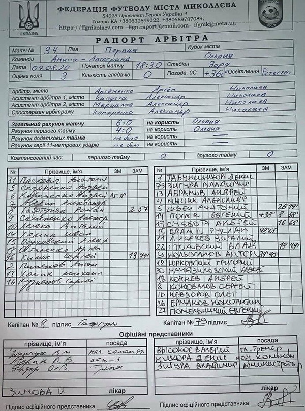 А от у зв’язку з подальшою відсутністю представника поліції, яку повинна була забезпечити команда «Арарат», другий тайм не відбувся. Очікується рішення Федерації футболу міста Миколаєва, чи будуть команди догравати цей матч пізніше, чи перемога зарахується за «Ольвією» автоматично.