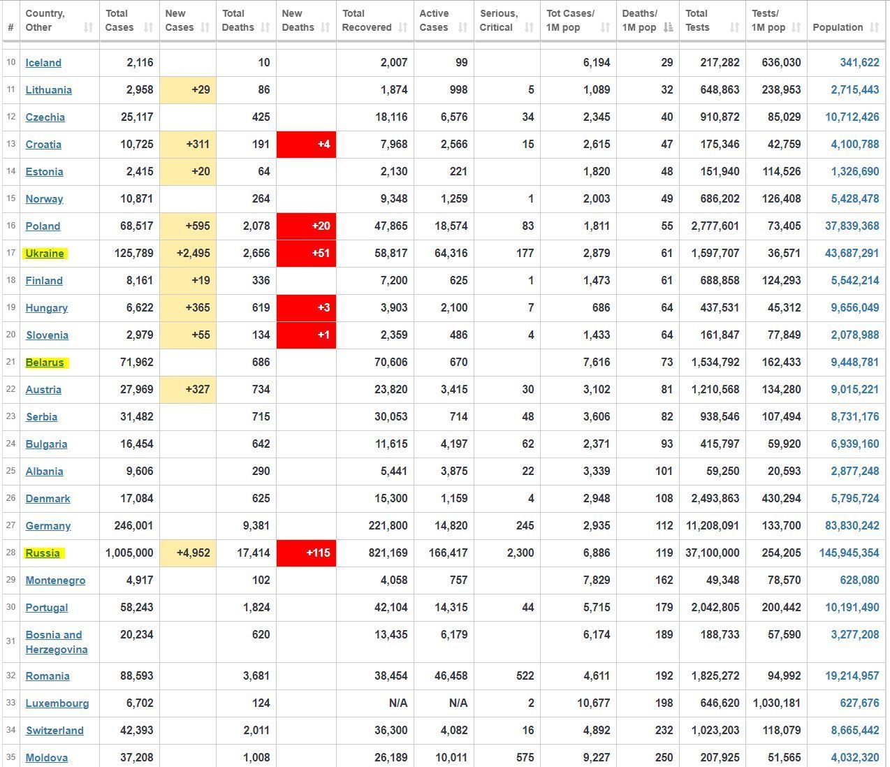 В России показатель смертности от коронавируса на 1 миллион жителей в два раза выше, чем в Украине. Так, в Украине данный показатель составляет 61 случай на 1 миллион жителей, в Беларуси — 73 случая, в России — 119.