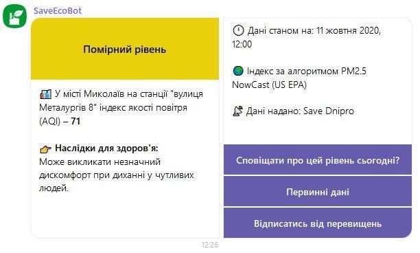 В воскресенье, 11 октября, в Корабельном районе города Николаева снова зафиксировано загрязнение атмосферного воздуха. Об этом стало известно из показаний сервиса SaveEcoBot, установленного на улице Металлургов. Так, в этом микрорайоне в полдень индекс качества воздуха «набрал» 71 балл. Отмечается, что при таком загрязнении возможны определенные последствия для здоровья: