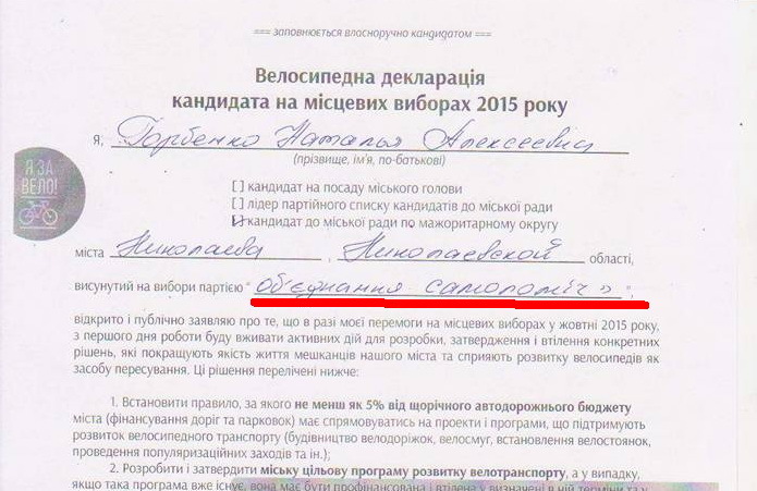 Так, Наталья Горбенко опять пообещала заняться развитием вело-инфраструктуры в городе Николаеве. Сменив партию, кандидат в депутаты горсовета следующего созыва снова подписала велосипедную декларацию. Почти такую же, как она уже подписывала в 2015 году, баллотируясь в горосовет от партии «Самопомощь».