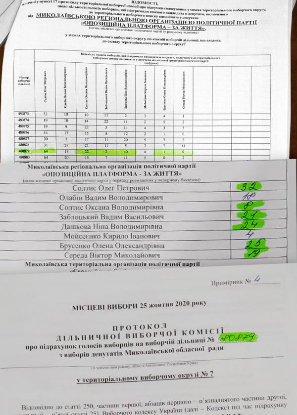 В протоколах Николаевской городской ТИК об итогах голосования по выборам депутатов облсовета в пределах части избирательного округа №7 и протоколы двух УИК о подсчете голосов на избирательных участках зафиксировали несоответствия. В количестве голосов за шесть кандидатов от местного отделения партии «Оппозиционная платформа — За жизнь» оказались разногласия.