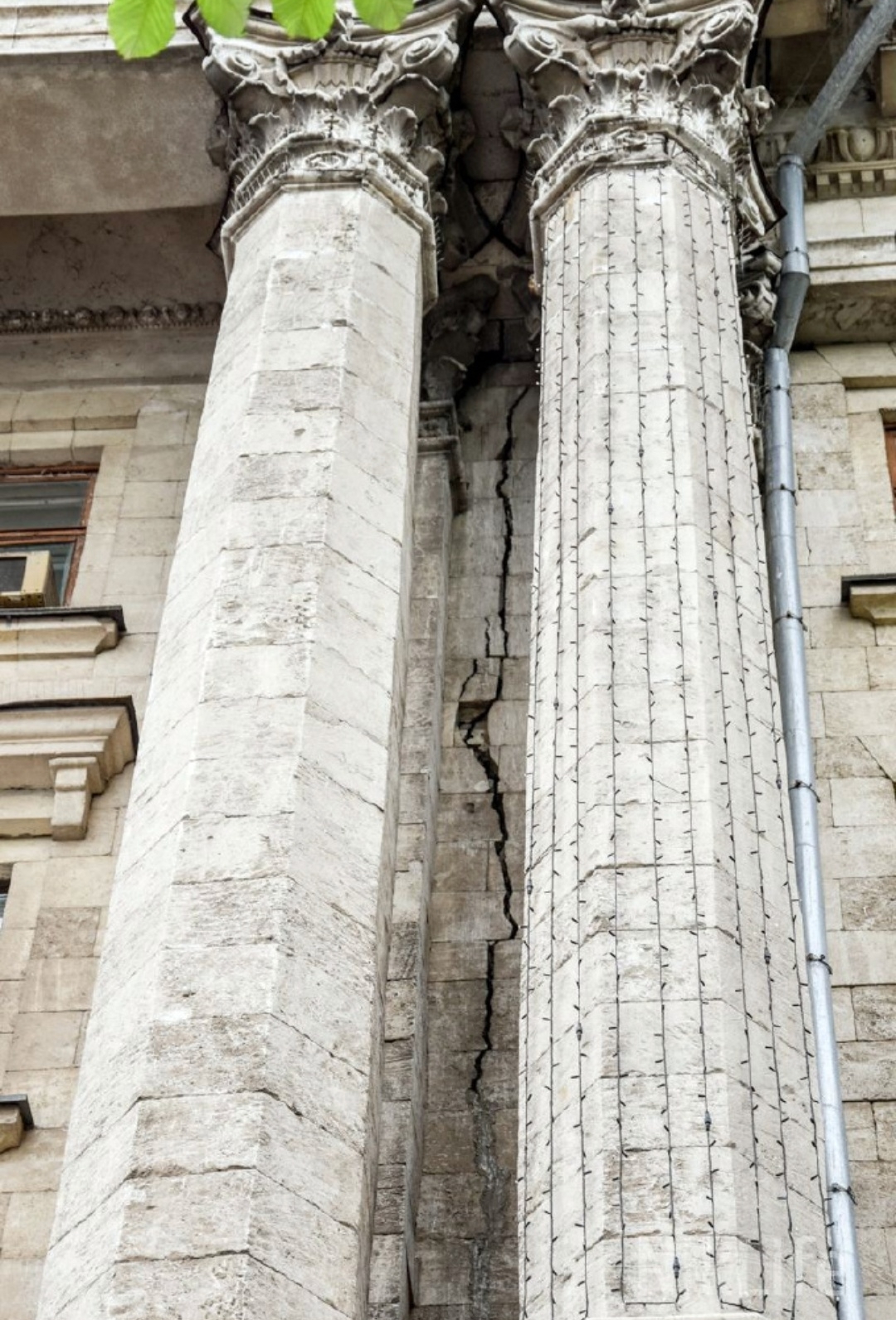 Ее можно заметить невооруженным взглядом, ведь даже колонны не могут ее скрыть, так как она располагается прямо между ними. И хоть о печальном состоянии здания, так же как о его аварийности, говорят долгие годы, настолько явное доказательство этого образовалось в течение последнего месяца.