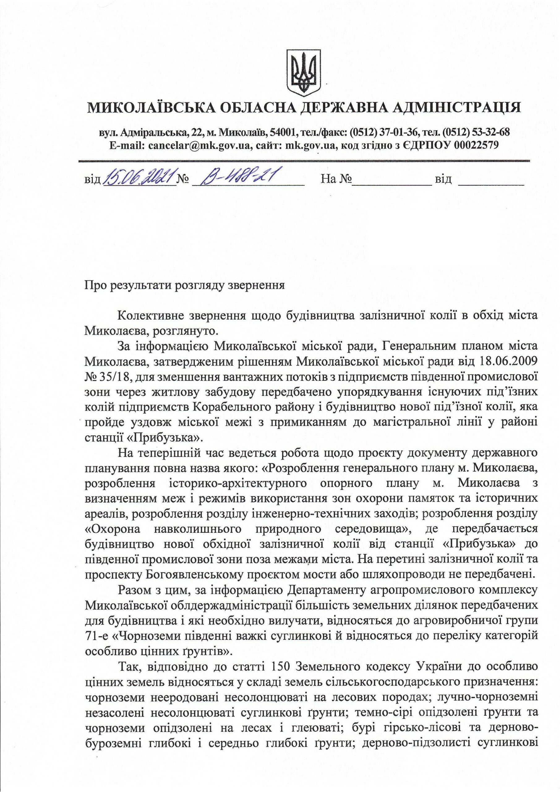 Жителям Корабельного района города Николаева, отправлявшим коллективное обращение (с более 600 подписями) в различные инстанции с просьбой о переносе железной дороги из центра жилого сектора за пределы города (на территорию области), пришел ответ и от Николаевской облгосадминистрации (письмо отправлялось на имя её председателя Виталия Кима).