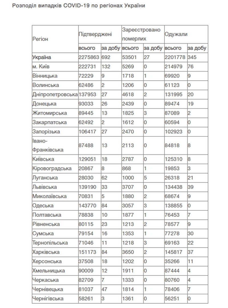 За все время пандемии в Украине заболели более 2,275 миллиона человек, выздоровели 2,2 миллиона. Зафиксировано 53,5 тысячи летальных случаев.