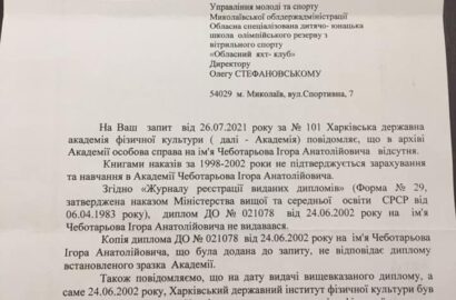 Игорь Чеботарев никогда не учился в Харьковском институте физической культуры, более того, на дату выдачи диплома этот вуз уже имел другое название. Об этом сообщили советнику губернатора в официальном ответе из вуза.