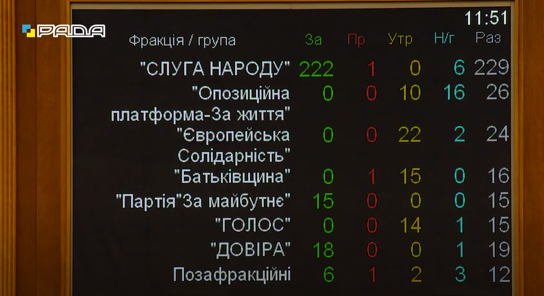 Как сообщает корреспондент «Корабелов.Инфо», за назначение проголосовали 222 депутата из фракции «Слуга народа», 18 депутатов от группы «Доверие», 15 — группы «За майбутнє» и 6 внефракционных депутатов. Кандидатуру не поддержали в полном составе фракции «Европейская солидарность», «Оппозиционная платформа — За жизнь», «Батькивщина» и «Голос».