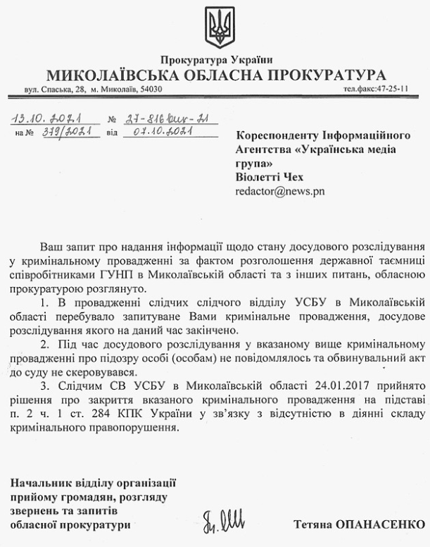 Как сказано в ответе на запрос, никому в рамках уголовного производства о подозрении не сообщалось. А в январе 2017 года дело было закрыто следователем УСБУ в связи с отсутствием состава правонарушения.