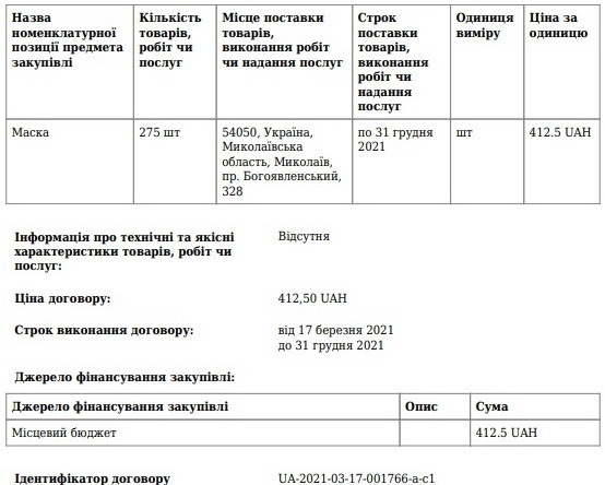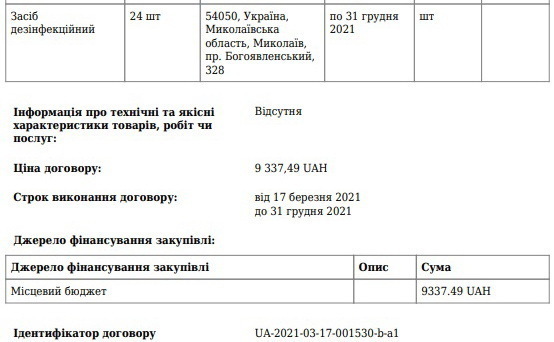 А на сумму в 9750 грн ФЛП Борик Светлана Михайловна, также проживающая в столице, до конца 2021 года должна поставить 24 единицы дезинфекционного средства по 389,06 грн. «за штуку» и 275 масок по 1,5 грн.: