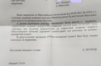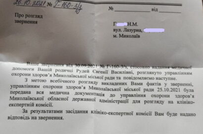 В ответах на жалобы Натальи Г., полученных ею от николаевских чиновников, говорится, что «с целью всестороннего рассмотрения изложенных в обращении фактов, управлением здравоохранения Николаевского горсовета 25.10.2021 вся медицинская документация была передана в управление здравоохранения Николаевской облгосадминистрации для рассмотрения на клинико-экспертной комиссии», результатов проведения которой теперь ожидает внучка умершей в карете скорой помощи Евгении Р.