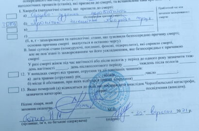«Я побежала на 3-й этаж в реанимацию, но никого не было, как будто все исчезли, больница пустая. Спустилась назад, наконец пришёл (еле шёл) первый с реанимации, второй — позже. Все неспеша. Приехала женщина с каталкой и говорит с улыбкой: «Куда спешить? Успеем»… Рядом другие скорые стояли, и никто не помог. В 22:20 бабушка умерла. Заключение о её смерти — подтверждение, что это было сердце», — отмечает Наталья Г., предоставив фото-копию документа.