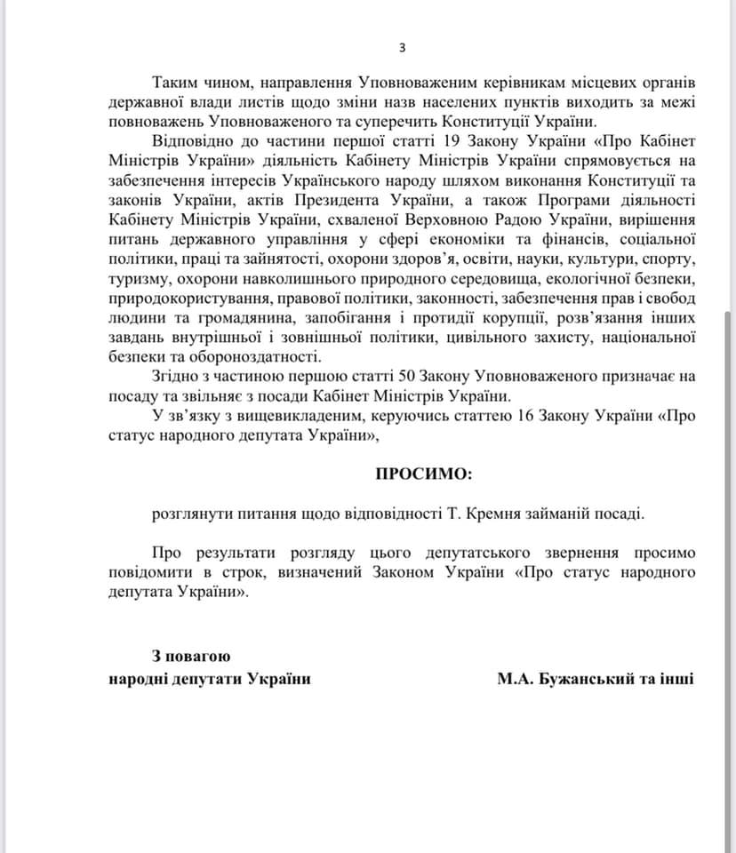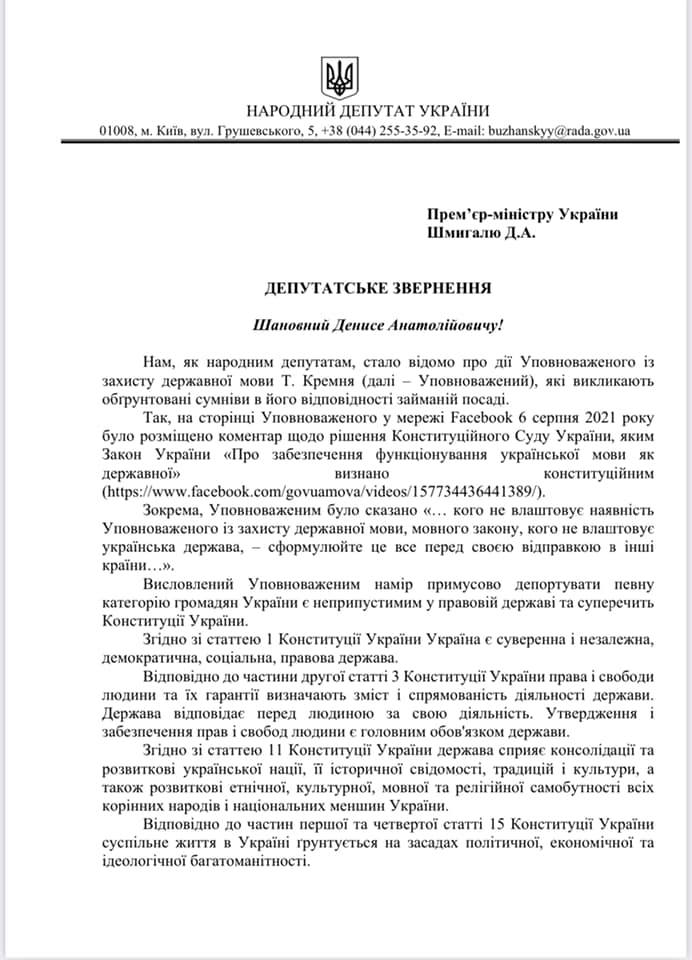 Ряд народных депутатов Украины, в том числе и николаевские, обратились к премьер-министру Денису Шмыгалю с просьбой рассмотреть вопрос соответствия Уполномоченного по защите государственного языка Тараса Креминя своей должности. Соответствующее обращение разместил на своей странице в социальной сети Facebook народный депутат от Николаевской области Игорь Негулевский.