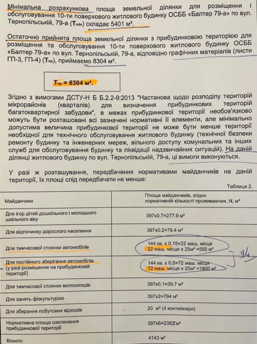 Стахурский также сослался на план «разделения территории для выделения придомовой территории для обслуживания многоквартирного дома №79-А по ул. Тернопольской (ОСМД «БАЛТЕР-79А)». В одном из пунктов документа значится, что минимальная расчетная площадь земельного участка для обслуживания этого дома составляет 5401 кв. м. Но окончательно принятая площадь — 8304 кв. м, что само по себе немало.
